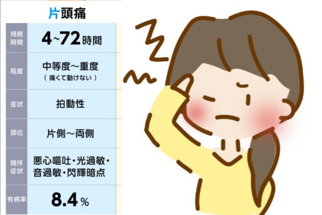 有病率が8.4%と頻度は高く~女性の方が多いようです~痛みは片側性および拍動性(脈打つような痛み)が続きます。